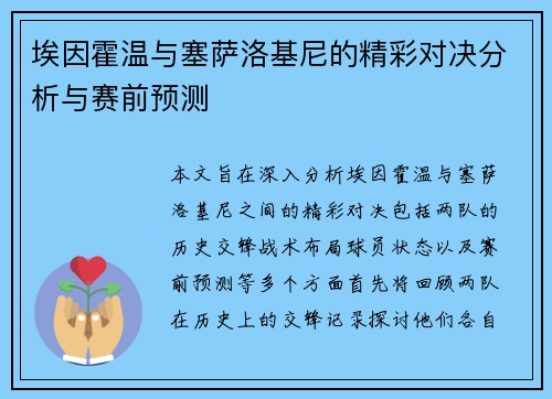 埃因霍温与塞萨洛基尼的精彩对决分析与赛前预测