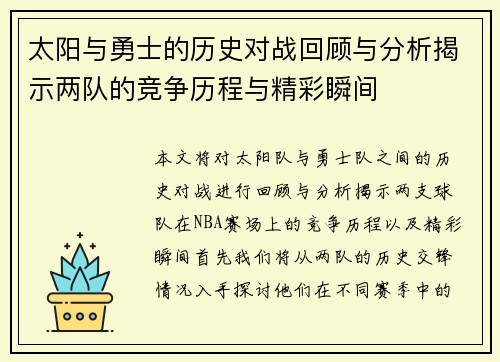 太阳与勇士的历史对战回顾与分析揭示两队的竞争历程与精彩瞬间